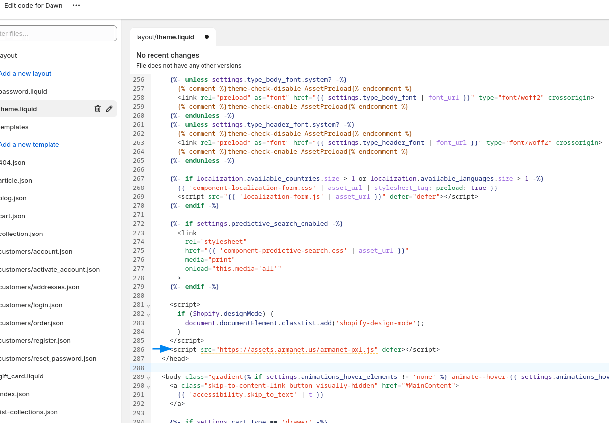 - In the left sidebar, locate and select the theme.liquid file under the Layout section.